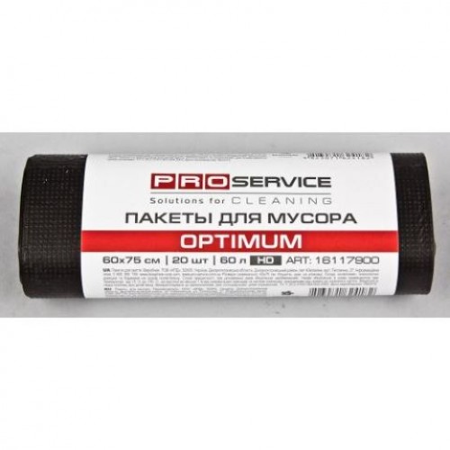 PRO service пакеты для мусора Optimum 60 л 20 шт черные Особенность Намотка 20 шт. Объем 60 л Размер 35х60 Новинка Нет Топ продаж Нет Пакеты для мусора объемом 60 литров применяются с корзинами или контейнерами увеличенной емкости в местах с большой проходимостью людей.