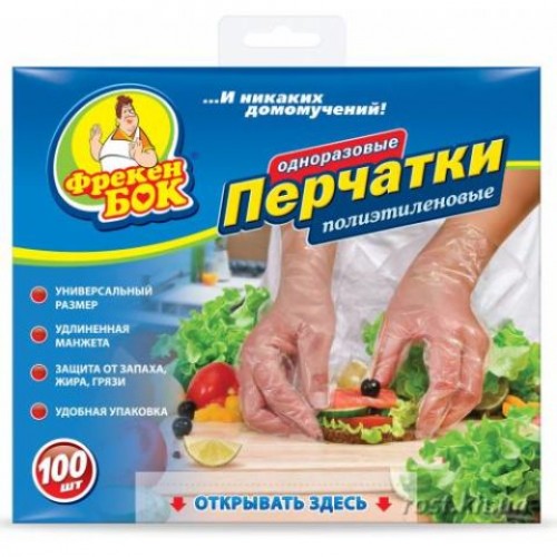 Перчатки Фрекен БОК универсальные полиэтиленовые одноразовые 100 шт Одноразовые перчатки ТМ Фрекен БОК изготовлены из полиэтилена высокой плотности. Они надежно защищают руки от запахов, жира и грязи, химических раздражителей (краски, лака, косметических средств). Удлиненная манжета позволяет дополнительно защитить руки от загрязнений. Каждая перчатка подходит как для левой, так и правой ладони. Уникальная упаковка обеспечивает удобство хранения, а специальное перфорированное отверстие позволяет легко извлекать перчатки поштучно. Использование: для чистки овощей, для разделки мяса и рыбы, для лакокрасочных работ, для окрашивания волос.