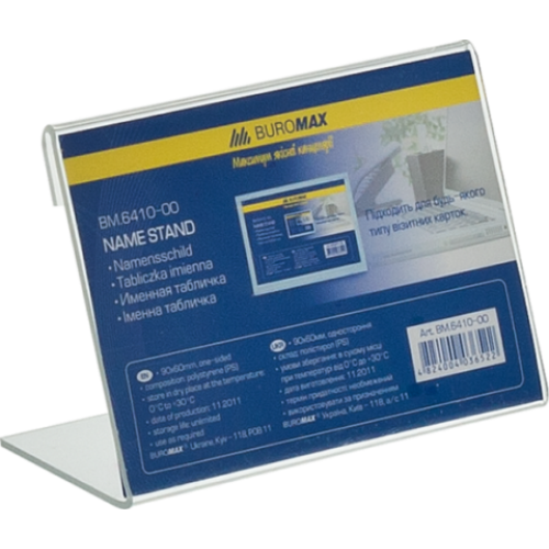 Именная табличка односторонняя 90*60мм Материал полистирол Особенность - Размер 90х60 мм Цвет прозрачный Новинка Нет Топ продаж Нет Именная табличка BUROMAX – помощник во время проведений конференций, семинаров, презентаций, круглых столов. Также, применяется в ресторанах и кафе для демонстрации специальных меню, «горячих предложений», а в отелях и офисах – для обозначения столика рецепции и администратора. Полиграфический вкладыш легко меняется, а прозрачный полистирол, из которого изготовлена табличка BUROMAX , не искажает цветопередачу и четкость изображений. изготовлена из прозрачного полистирола углубление для пальцев позволяет легко заменить вкладыш в табличке толщина: 2,5 мм размер: 90х60мм BUROMAX – это качество и надежность!