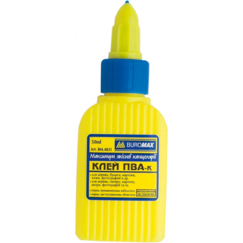 Клей ПВА BUROMAX 50 мл, колпачок-дозатор Особенность - Тип ПВА Объем, вес 50 мл Новинка Нет Топ продаж Да C Клей ПВА BUROMAX – станет незаменимым помощником в работе. Подходит для повседневного использования в офисе, а также для творчества. Характеристики: объем – 50 мл. для склеивания бумаги, картона, фотографий, дерева, ткани, пробки пластиковый флакон с дозатором, который выкручивается колпачок-дозатор регулирует подачу клея и предотвращает высыханию клей наносится тонкой линией в горизонтальном положении не вытекает смывается водой не токсичен BUROMAX – это качество и надежность!
