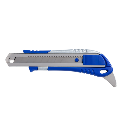 Нож универсальный 18мм, мет. направляющая, пласт. корпус c резин. вставками Особенность Тип универсальный Материал корпуса Ширина лезвия 18 мм Новинка Да Топ продаж Да мет. направляющая, пластиковый корпус, дополнительный нож для разрезания коробок и открытия банок с краской, блистер