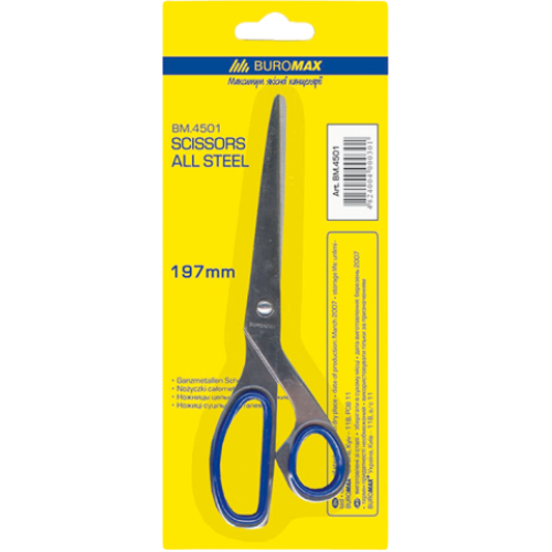 Ножницы цельнометалические BUROMAX, 197 мм Особенность резиновые вставки Длина 197 мм Материал ручек металл Новинка Нет Топ продаж Да Офисные ножницы BUROMAX : подходят для резки бумаги, картона, фотобумаги, ткани и т.д. у ножниц плавный и мягкий ход резки закругленные лезвия изготовлены из нержавеющей стали, и гарантируют безопасность во время резки цельнометаллический корпус с резиновыми синими вставками на ручках эргономичная форма ручек и прорезиненные вставки обеспечивают комфорт во время работы индивидуальная блистерная упаковка открытого типа длина ножниц: 197 мм Ножницы BUROMAX – это качество и надежность!
