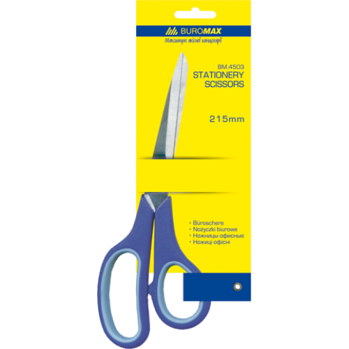 Ножницы с резиновыми вставками BUROMAX, 215 мм Особенность резиновые вставки Длина 215 мм Материал ручек пластик Новинка Нет Топ продаж Да Офисные ножницы BUROMAX : подходят для резки бумаги, картона, фотобумаги, ткани и т.д. у ножниц плавный и мягкий ход резки закругленные лезвия изготовлены из нержавеющей стали, и гарантируют безопасность во время резки ручки выполнены из синего пластика с прорезиненными вставками эргономичная форма ручек и прорезиненные вставки обеспечивают комфорт во время работы индивидуальная блистерная упаковка открытого типа длина ножниц: 215 мм Ножницы BUROMAX – это качество и надежность!