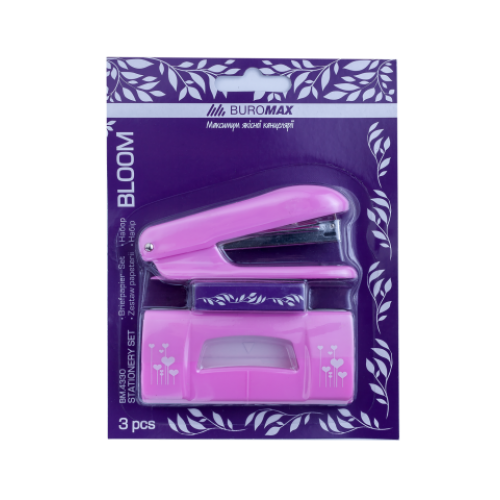 Комплект (степлер №10 + дырокол + скобы) BLOOM, блистер Материал пластик Особенность в комплекте дырокол и скобы Наличие дестеплера да Пробивная мощность, листов Скоба №10 Новинка Нет Топ продаж Нет Нежный женский функциональный набор офисных инструментов BLOOM от BUROMAX – станет замечательным подарком для ценительнице стильных офисных аксессуаров. Набор выполнен в розовом цвете с принтом. В наборе: Степлер: Материал: пластик Пробивная мощность: 12 листов 80 г/м 2 Наличие дестеплера: да Скоба: №10 Размеры степлера: 105x45x28мм Дырокол: Материал: металлическая подошва, пластиковый рычаг Пробивная мощность: 5 листов 80 г/м 2 Диаметр пробивного отверстия: 6 мм Расстояние между пробивными отверстиями: 80 мм Размеры дырокола: 103x47x21мм Скобы №10, 1000 шт. в упаковке BUROMAX – надежность, функциональность и удобство!