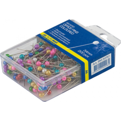 Булавки цветные 34мм, 200шт. Материал Металл Особенность цветная пластиковая головка Размер 34 мм Тип булавки Новинка Нет Топ продаж Да Булавки цветные BUROMAX – идеально походят для канцелярских и бытовых нужд! Отлично закалывает бумагу и ткань. Цветная пластиковая головка. Упакованы в пластиковый контейнер с завесом по 200 шт..