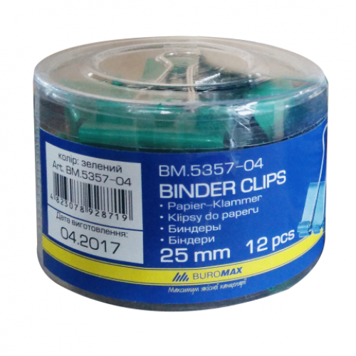 Биндер (зажим для бумаг) 25 мм, цена за 12 шт., туба, зеленый Цвет Ширина Новинка Нет Топ продаж Нет Зажимы для бумаг BUROMAX - отличное решение для скрепления большого количества листов! Данные биндеры не деформируют бумагу! Изготовлены из качественного металла, окрашенного черным, красным, синим, зеленым и серым цветами, что позволяет выбрать любимый цвет и систематизировать документы! Материал: металл Ширина: 25 мм Цвета: черный, зеленый, красный, синий, серый Упаковка: 12 шт. в пластиковой тубе