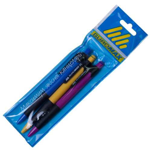 Набор из 3-х шариковых авт. ручек 0.7м, блистер Особенность в блистере Вид шариковая Длина стержня, мм 107 Замена стержня да Количество в упаковке 3 шт. Стержень BM.8003 Тип ручки автоматическая Толщина линии, мм 0.7 Цвет чернила Синий Грип Да Новинка Нет Топ продаж Нет Шариковая ручка BUROMAX - идеальное решение для офиса, школы и дома! Корпус изготовлен из качественного пластика с резиновым гриппом черного цвета, который препятствует возникновению мозолей на пальцах и обеспечивает комфортное письмо. чернила на водной основе обеспечивают мягкое и легкое письмо для удобства крепления ручки есть клип в цвет гриппа цвет чернил: синий цветовое решение корпуса: черный, синий, бордовый, зеленый, фиолетовый сменный стержень 3 шт. упакованы в блистер. Ручки BUROMAX - отличный пишущий инструмент на каждый день!