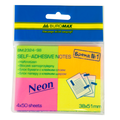 Блок бумаги для заметок NEON 38 x 51мм, 50 листов, ассорти (4 штуки в блистере), с клейким слоем Особенность набор Размер 38х51 мм Серия NEON Цвет ассорти Количество листов 50 Плотность бумаги, г/м2 75 Тип склеивания склеенный Новинка Нет Топ продаж Да Блок для заметок с клейким слоем - это Ваш помощник для быстрого создания записей и их хранения на видном месте! Часто выступают в роли закладок, маркеров, мини-заметок. Идеально подходят для использования сотрудниками офисов, на рецепциях, школьниками, студентами и просто в повседневной жизни. Уникальность позиции - блок разделен на 4 части Яркие неоновые цвета Возможно многократное переклеивание, не оставляет следов клея Надежно держатся на гладких поверхностях и предметах Размер блока: 38х51мм Упаковка: 4 блока по 50 листов в блистере