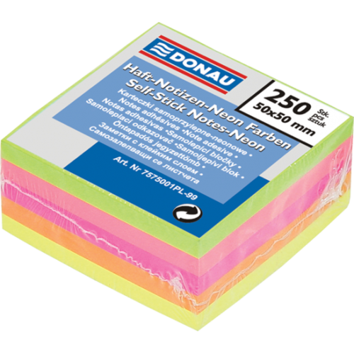 Блок для заметок 50х50 мм, 250 л. (неон, ассорти) Особенность - Размер 50х50 мм Серия NEON Цвет ассорти Количество листов 250 Плотность бумаги, г/м2 75 Тип склеивания склеенный Новинка Нет Топ продаж Нет Высококачественная бумага для заметок с клейким слоем. Особый клеевой состав позволяет размещать записку или заметку на любой поверхности. Листы с заметками можно переклеивать несколько раз. При отклеивании не оставляет следов, не пачкается, смывается при помощи воды. 5 неоновых цветов ассорти.
