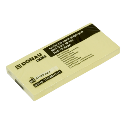 Блок для заметок 51х38 мм, 100л. (эко) Особенность - Размер 51х38 мм Серия ЭКО Цвет желтый Количество листов 100 Плотность бумаги, г/м2 70 Тип склеивания склеенный Новинка Нет Топ продаж Нет Высококачественная бумага для заметок с клейким слоем. Особый клеевой состав позволяет приклеивать листы с заметками к любой поверхности. Пастельный жёлтый цвет не отвлекает от содержимого в заметке. Многократно переклеиваются, не оставляя следов. Плотность: 70 г/м2.