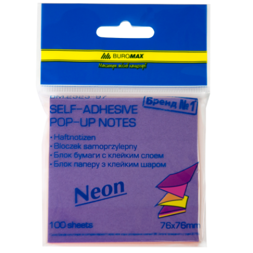 Блок для заметок NEON 76 x76мм, 100 листов, с клейким слоем Особенность Гирлянда Размер 76х76 мм Серия NEON Цвет ассорти Количество листов 100 Плотность бумаги, г/м2 75 Тип склеивания склеенный Новинка Нет Топ продаж Да Блок для заметок с клейким слоем - это Ваш помощник для быстрого создания записей и их хранения на видном месте! Часто выступают в роли закладок, маркеров, мини-заметок. Идеально подходят для использования сотрудниками офисов, на рецепциях, школьниками, студентами и просто в повседневной жизни. Блок бумаги разноцветный в виде гирлянды (Z-сборки) Кроме прямого назначения, может использоваться как украшение на праздники Наличие клейкого слоя - для удобной фиксации на рабочей поверхности Насыщенные неоновые цвета (фиолетовый, розовый, оранжевый, желтый) Размер: 76х76 мм Количество листов: 100 шт. (4 цвета по 25 шт.) Плотность бумаги: 70 г / м2 Упаковка: 1 шт. в пакете с европодвесом
