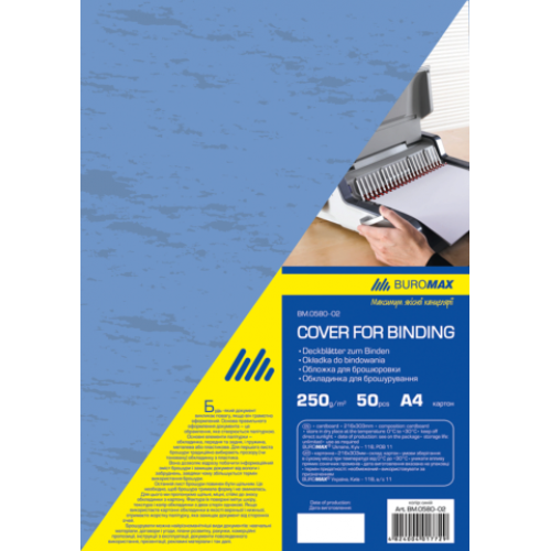 Обложка картонная "под кожу" А4 250г/м2, (50шт./уп.), синий Количество сшиваемых листов - Материал обложки картон Материал пружины - Плотность обложки г/м2 250 г/м2 Формат обложки A4 Цвет обложки синий Цвет пружины - Диаметр пружины, мм - Новинка Нет Топ продаж Да Обложка с фактурной поверхность «под кожу» BUROMAX для переплета и профессионального оформления документов! Обеспечивает защиту от механических повреждений (потертости, загрязнения). Возможность выбора индивидуального стиля: различный ассортимент цветов обложек. Предназначена для переплета формата А4. В упаковка 50 шт.