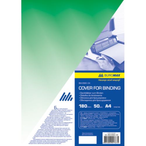 Обложка прозрачная А4 180 мкм, (50шт./уп.), зеленый Количество сшиваемых листов - Материал обложки пластик Материал пружины - Плотность обложки г/м2 180 мкм Формат обложки A4 Цвет обложки зеленый Цвет пружины - Диаметр пружины, мм - Новинка Нет Топ продаж Да Обложка пластиковая BUROMAX для переплета и профессионального оформления документов! Обеспечивает удобство хранения и простоту работы со сшитыми документами. Есть возможность выбора индивидуального стиля: различный ассортимент цветов обложек. Изготовлена из качественного пластик. Предназначена для переплета формата А4. В упаковка 50 шт.