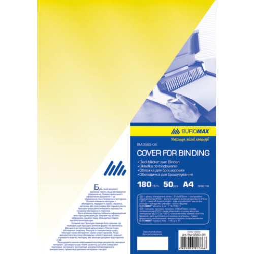 Обложка прозрачная А4 180 мкм, (50шт./уп.), желтый Количество сшиваемых листов - Материал обложки пластик Материал пружины - Плотность обложки г/м2 180 мкм Формат обложки A4 Цвет обложки желтый Цвет пружины - Диаметр пружины, мм - Новинка Нет Топ продаж Да Обложка пластиковая BUROMAX для переплета и профессионального оформления документов! Обеспечивает удобство хранения и простоту работы со сшитыми документами. Есть возможность выбора индивидуального стиля: различный ассортимент цветов обложек. Изготовлена из качественного пластик. Предназначена для переплета формата А4. В упаковка 50 шт.
