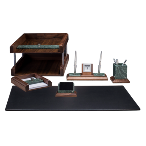 Набор настольный из натур. дерева и мрамора, 6 предметов, орех Особенность Тип дерево, мрамор Цвет орех Количество предметов в наборе 6 Новинка Нет Топ продаж Нет Жесткая подкладка для письма: 653х439х5мм. Горизонтальный двойной лоток для документов с пресс-папье. Подставка с двумя шариковыми ручками и часами. Подставка для карандашей и ручек. Бокс с бумагой для записей: 100х150 мм с пресс-папье. Подставка для визиток. Упаковка: 1/2 кмпл.