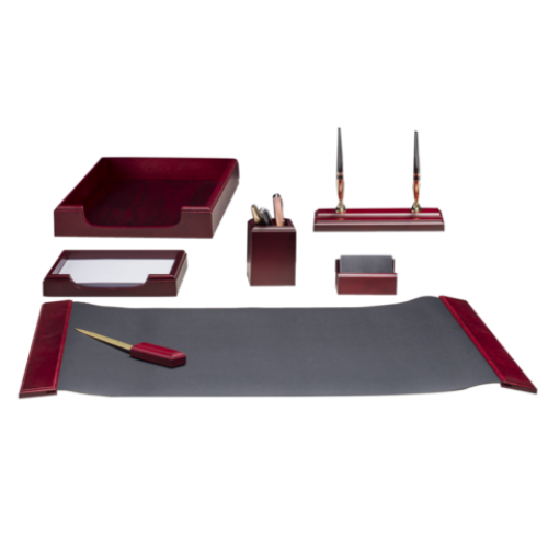 Набор настольный из натурального дерева, 7 предметов, красное дерево Особенность Тип дерево Цвет красное дерево Количество предметов в наборе 7 Новинка Нет Топ продаж Да Гибкая подкладка для письма с деревянным декором: 670х425х9мм. Горизонтальный лоток для документов. Подставка с двумя шариковыми ручками. Подставка для карандашей и ручек. Бокс с бумагой для записей: 100х150 мм. Нож для вскрытия корреспонденции. Подставка для визиток. Упаковка: 1/5 кмпл.