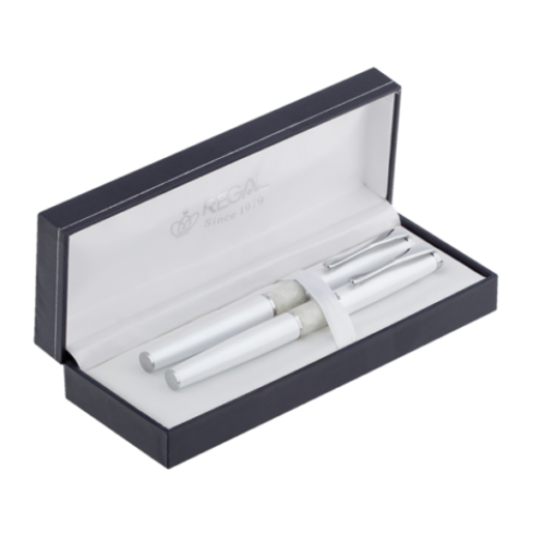 Комплект ручек (перо+роллер) в подарочном футляре L, белый Особенность - Длина стержня, мм - Тип набора перо+роллер Упаковка подарочный футляр тип L Цвет чернила черный Новинка Нет Топ продаж Нет Глянцевый хромированный корпус белого цвета, глянцевые хромированные детали.