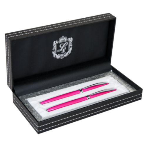 Комплект ручек (П+Р) "Elegance" с прозрачными кристаллами, розовый Особенность с кристаллами Длина стержня, мм - Тип набора перо+роллер Упаковка подарочный футляр Цвет чернила черный Новинка Нет Топ продаж Нет Корпус ручек покрыт лаком, материал корпуса латунь, элементы корпуса и клип хромированы, 6 кристаллов по радиусу ручек, 1 кристалл рядом с письменным узлом, амортизация стержня для мягкого письма, поршневой конвертер подачи чернил или использование картриджей. В подарочном футляре.