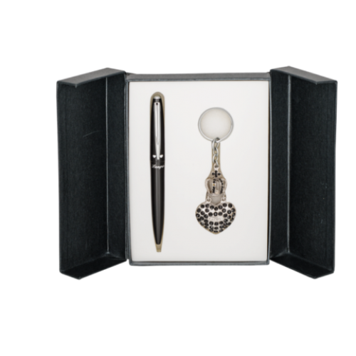 Набор подарочный "Corona": ручка шариковая + брелок, черный Особенность - Длина стержня, мм 115 Тип набора ручка шариковая+брелок Упаковка подарочный футляр Цвет чернила Синий Новинка Нет Топ продаж Нет Корпус ручки покрыт лаком, материал корпуса латунь, элементы корпуса и клип хромированы. Брелок в виде короны с сердцем, оформлен россыпью кристаллов, хромированный метал, кольцо для ключей,сменный стержень тип cross LS.499000.