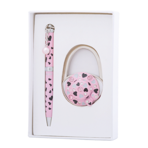 Набор подарочный "Elegance": ручка (Ш) + крючек д/ сумки, розовый Особенность - Длина стержня, мм 67 Тип набора ручка шариковая+крючек для сумки Упаковка подарочный футляр Цвет чернила Синий Новинка Нет Топ продаж Нет Ручка покрыта лаком с принтом "сердце", элементы корпуса хромированы, 6 кристаллов по радиусу корпуса, материал корпуса - латунь, кулон в виде жемчужины. Крючок для сумки в виде элегантной шляпки инкрустированной россыпью кристаллов, лаковое покрытие, хромированный метал,сменный стержень тип D1 LS.499002.