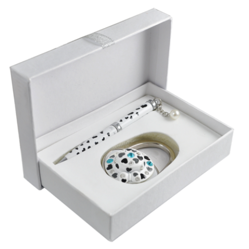 Набор подарочный "Elegance": ручка шариковая + крючек д/ сумки, белый Особенность - Длина стержня, мм 67 Тип набора ручка шариковая+крючек для сумки Упаковка подарочный футляр Цвет чернила Синий Новинка Нет Топ продаж Нет Ручка покрыта лаком с принтом "сердце", элементы корпуса хромированы, 6 кристаллов по радиусу корпуса, материал корпуса - латунь, кулон в виде жемчужины. Крючок для сумки в виде элегантной шляпки инкрустированной россыпью кристаллов, лаковое покрытие, хромированный метал,сменный стержень тип D1 LS.499002.
