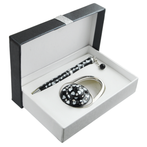 Набор подарочный "Elegance": ручка шариковая + крючек д/ сумки, черный Особенность - Длина стержня, мм 67 Тип набора ручка шариковая+крючек для сумки Упаковка подарочный футляр Цвет чернила Синий Новинка Нет Топ продаж Нет Ручка покрыта лаком с принтом "сердце", элементы корпуса хромированы, 6 кристаллов по радиусу корпуса, материал корпуса - латунь, кулон в виде жемчужины. Крючок для сумки в виде элегантной шляпки инкрустированной россыпью кристаллов, лаковое покрытие, хромированный метал,сменный стержень тип D1 LS.499002.