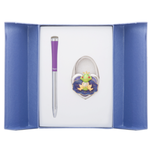 Набор подарочный "Fairy Tale": ручка (Ш) + крючек д/ сумки, фиолет. Особенность - Длина стержня, мм 115 Тип набора ручка шариковая+крючек для сумки Упаковка подарочный футляр Цвет чернила Синий Новинка Нет Топ продаж Нет Ручка покрыта лаком, элементы корпуса хромированы, 8 кристаллов по радиусу корпуса, материал корпуса - латунь. Крючок для сумки в виде царевны-лягушки инкрустированной кристаллами, лаковое покрытие, хромированный метал,сменный стержень тип cross LS.499000.