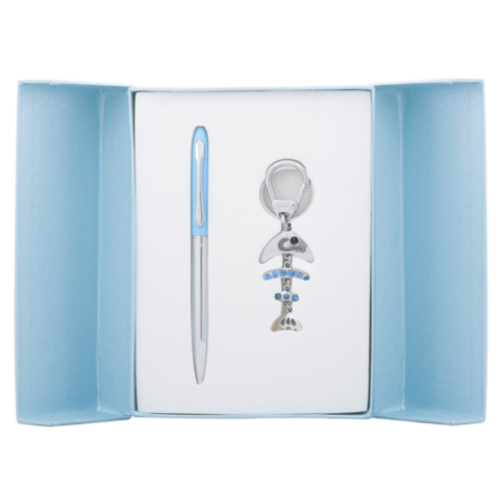Набор подарочный "Fish": ручка шариковая + брелок, синий Особенность - Длина стержня, мм 115 Тип набора ручка шариковая+брелок Упаковка подарочный футляр Цвет чернила Синий Новинка Нет Топ продаж Нет Ручка покрыта лаком, элементы корпуса хромированы, материал корпуса- латунь. Брелок -рыбка с 9 кристаллами, хромированный метал, карабин и кольцо для ключей,сменный стержень тип cross LS.499000.