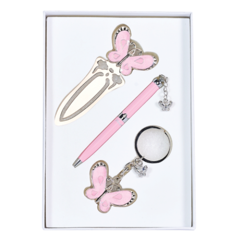 Набор подарочный "Fly": ручка шариковая + брелок + закладка, розовый Особенность - Длина стержня, мм 67 Тип набора ручка шариковая+брелок+закладка Упаковка подарочный футляр Цвет чернила Синий Новинка Нет Топ продаж Нет Ручка покрыта лаком, элементы корпуса хромированы, материал корпуса - латунь, 6 кристаллов по радиусу корпуса, кулон в виде бабочки. Брелок - бабочка, элементы покрыты лаком, кольцо для ключей. Закладка для книги - изголовье в форме бабочки, сменный стержень тип D1 LS.499002.