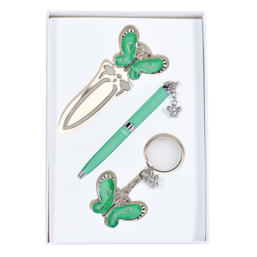 Набор подарочный "Fly": ручка шариковая + брелок + закладка, зеленый Особенность - Длина стержня, мм 67 Тип набора ручка шариковая+брелок+закладка Упаковка подарочный футляр Цвет чернила Синий Новинка Нет Топ продаж Нет Ручка покрыта лаком, элементы корпуса хромированы, материал корпуса - латунь, 6 кристаллов по радиусу корпуса, кулон в виде бабочки. Брелок - бабочка, элементы покрыты лаком, кольцо для ключей. Закладка для книги - изголовье в форме бабочки, сменный стержень тип D1 LS.499002.