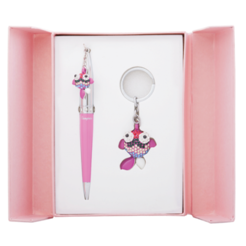 Набор подарочный "Goldfish": ручка шариковая + брелок, малиновый Особенность - Длина стержня, мм 115 Тип набора ручка шариковая+брелок Упаковка подарочный футляр Цвет чернила Синий Новинка Нет Топ продаж Нет Ручка покрыта лаком, элементы корпуса хромированы, материал корпуса - латунь, 8 кристаллов по радиусу корпуса, кулон в виде рыбки в россыпи разноцветных кристаллов. Брелок - рыбка инкрустированная разноцветными кристаллами, лак, кольцо для ключей, хромированный метал,сменный стержень тип cross LS.499000.