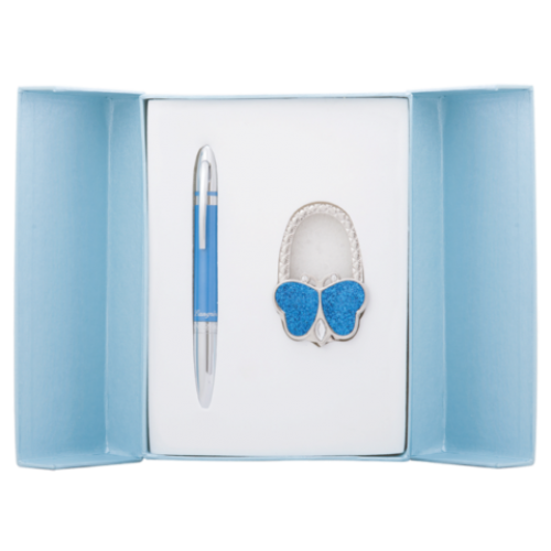 Набор подарочный "Lightness": ручка шариковая + крючек д/ сумки, синий Особенность - Длина стержня, мм 98 Тип набора ручка шариковая+крючек для сумки Упаковка подарочный футляр Цвет чернила Синий Новинка Нет Топ продаж Нет Ручка покрыта лаком, элементы корпуса хромированы, гравировка по диаметру корпуса, материал корпуса - латунь. Крючок для сумки в виде элегантной бабочки, эффект на крыльях - алмазная крошка, инкрустирована 3 кристаллами, хромированный метал,сменный стержень тип parker LS.499001.
