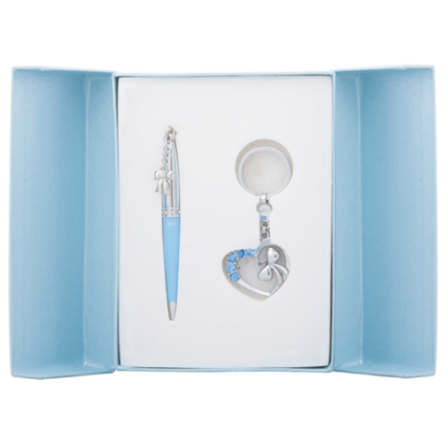 Набор подарочный "Love": ручка шариковая + брелок, синий Особенность - Длина стержня, мм 115 Тип набора ручка шариковая+брелок Упаковка подарочный футляр Цвет чернила Синий Новинка Нет Топ продаж Нет Ручка покрыта лаком, элементы корпуса хромированы, материал корпуса - латунь, 8 кристаллов по радиусу, кулон - бантик Тиффани. Брелок - Сердце с подвеской бантик Тиффани, 5 крупных кристаллов, кольцо для ключей, хромированный метал,сменный стержень тип cross LS.499000.