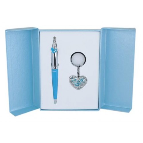 Набор подарочный "Miracle": ручка шариковая + брелок, синий Особенность - Длина стержня, мм 115 Тип набора ручка шариковая+брелок Упаковка подарочный футляр Цвет чернила Синий Новинка Нет Топ продаж Нет Красота в деталях. Ручка покрыта лаком, элементы корпуса хромированы, материал корпуса - латунь, 8 кристаллов по радиусу корпуса, кулон в виде сердца с кристаллами. Массивный брелок - сердце, ажурный хромированный металл инкрустированный разноцветными кристаллами, кольцо для ключей,сменный стержень тип cross LS.499000.