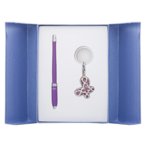Набор подарочный "Night Moth": ручка шариковая + брелок, фиолетовый Ручка покрыта лаком, элементы корпуса хромированы, оригинальное строение корпуса, материал корпуса - латунь, 6 кристаллов по радиусу. Брелок - Бабочка, объемная, россыпь кристаллов кольцо для ключей, хромированный метал,сменный стержень тип D1 LS.499002.