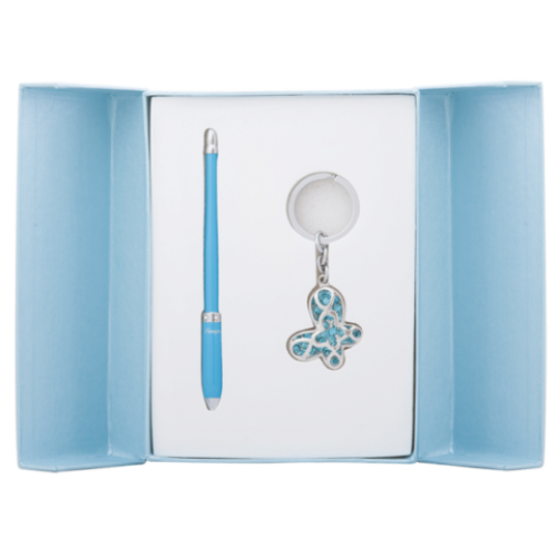 Набор подарочный "Night Moth": ручка шариковая + брелок, синий Особенность - Длина стержня, мм 115 Тип набора ручка шариковая+брелок Упаковка подарочный футляр Цвет чернила Синий Новинка Нет Топ продаж Нет Ручка покрыта лаком, элементы корпуса хромированы, оригинальное строение корпуса, материал корпуса - латунь, 6 кристаллов по радиусу. Брелок - Бабочка, объемная, россыпь кристаллов кольцо для ключей, хромированный метал,сменный стержень тип D1 LS.499002.