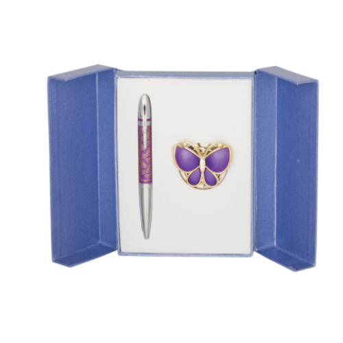 Набор подарочный "Papillon": ручка (Ш) + крючок д/ сумки, фиолетовый Особенность - Длина стержня, мм 98 Тип набора ручка шариковая+крючек для сумки Упаковка подарочный футляр Цвет чернила Синий Новинка Нет Топ продаж Нет Прикосновение бабочки. Ручка покрыта лаком с принтом - бабочки, элементы корпуса хромированы, гравировка по радиусу, материал корпуса- латунь. Крючок для сумки в виде бабочки, хромированный метал,сменный стержень тип parker LS.499001.