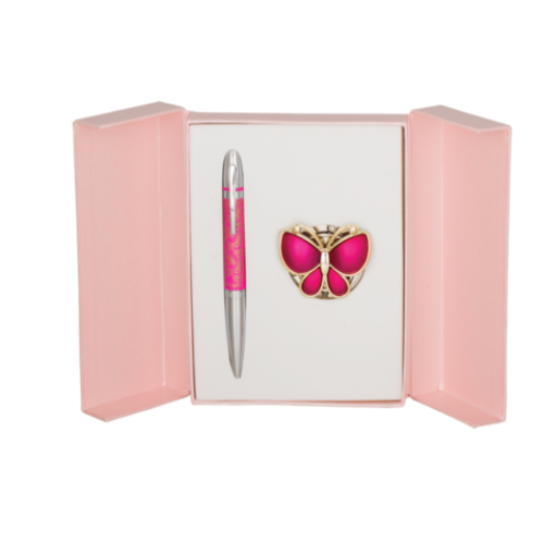 Набор подарочный "Papillon": ручка (Ш) + крючок д/ сумки, розовый Особенность - Длина стержня, мм 98 Тип набора ручка шариковая+крючек для сумки Упаковка подарочный футляр Цвет чернила Синий Новинка Нет Топ продаж Нет Прикосновение бабочки. Ручка покрыта лаком с принтом - бабочки, элементы корпуса хромированы, гравировка по радиусу, материал корпуса- латунь. Крючок для сумки в виде бабочки, хромированный метал,сменный стержень тип parker LS.499001.