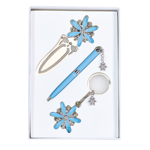 Набор подарочный "Star": ручка шариковая + брелок + закладка, синий Особенность - Длина стержня, мм 67 Тип набора ручка шариковая+брелок+закладка Упаковка подарочный футляр Цвет чернила Синий Новинка Нет Топ продаж Нет Ручка покрыта лаком, элементы корпуса хромированы, материал корпуса - латунь, 6 кристаллов по радиусу корпуса, кулон в виде звезды. Брелок - звезда инкрустированная кристаллами, элементы покрыты лаком, кольцо для ключей. Закладка для книги - изголовье в форме звезды инкрустированной кристаллами,сменный стержень тип D1 LS.499002.