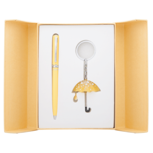 Набор подарочный "Umbrella": ручка шариковая + брелок, желтый Особенность - Длина стержня, мм 115 Тип набора ручка шариковая+брелок Упаковка подарочный футляр Цвет чернила Синий Новинка Нет Топ продаж Нет Ручка покрыта лаком, элементы корпуса хромированы, материал корпуса - латунь, 6 кристаллов по радиус. Брелок -Зонтик, россыпь кристаллов, пачка выполнена из 8 стеклянных элементов, кольцо для ключей, хромированный метал,сменный стержень тип cross LS.499000.